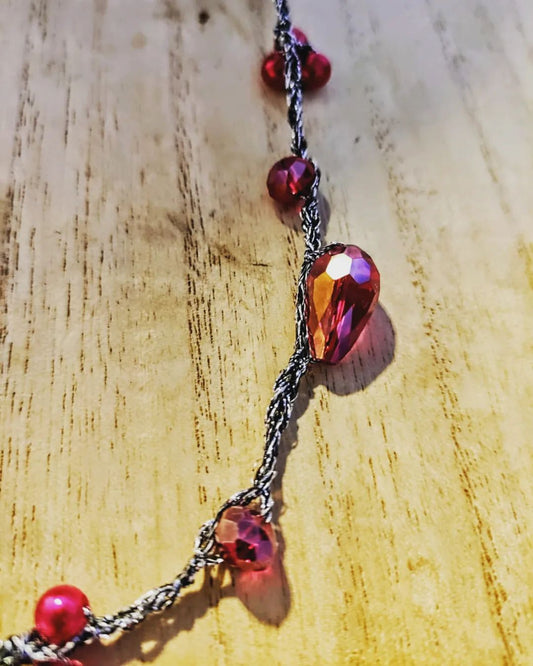 Collana con filato argento con pietre lilla, bianche e trasparenti.