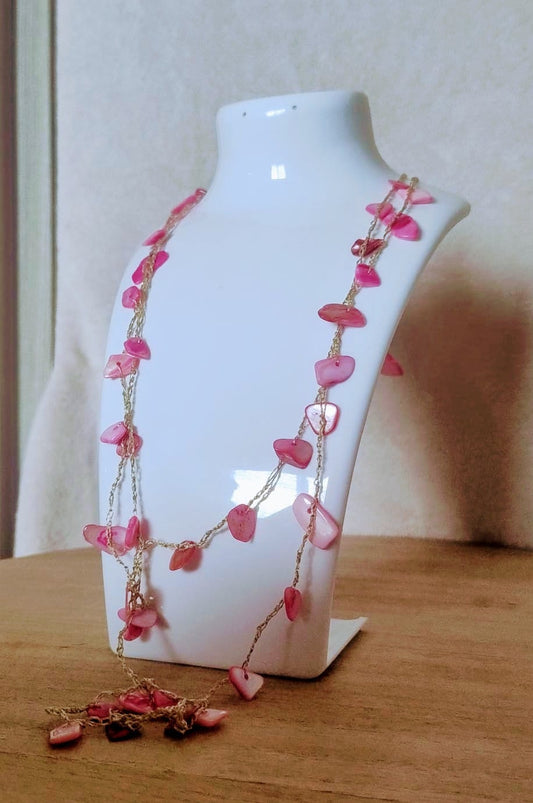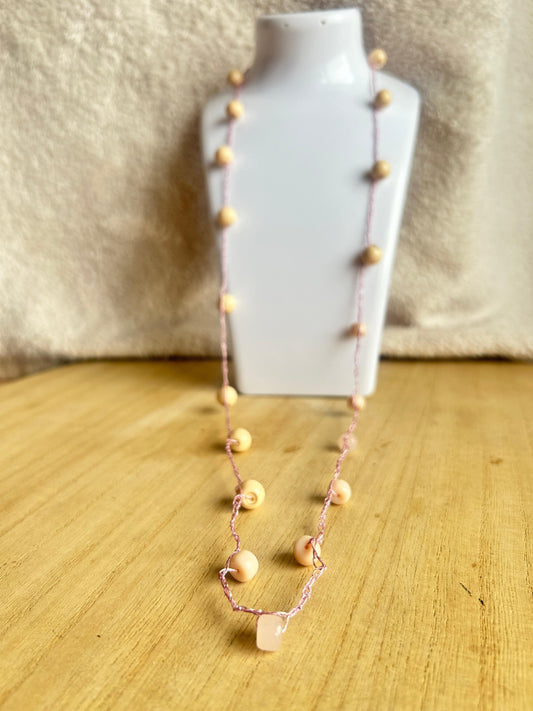 collana con piccole perline e corno rosa con orecchini in abbinamento