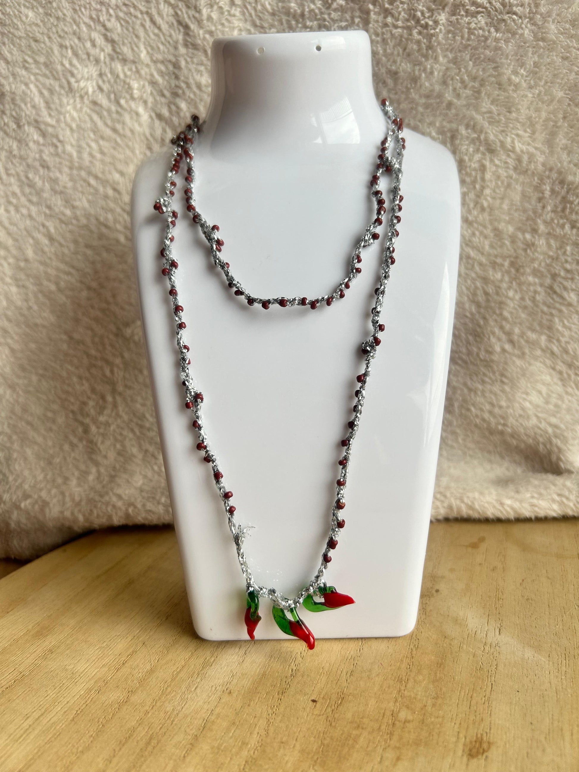 Questa collana unica combina un filato argentato con perline colorate vivaci, creando un contrasto accattivante. Piccoli pendenti a forma di corni rossi aggiungono un tocco distintivo e portafortuna. L'insieme di elementi conferisce alla collana un aspetto giocoso e originale, perfetto per aggiungere personalità e colore a qualsiasi outfi