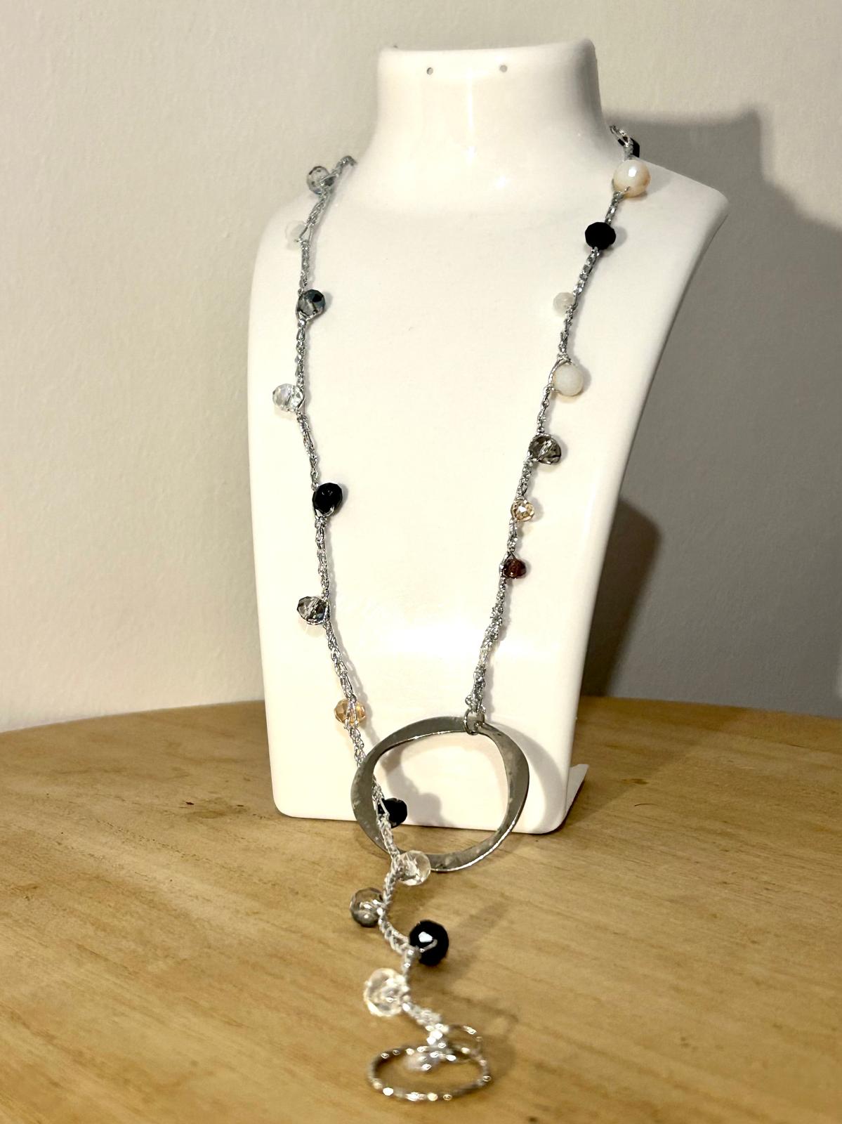 collana con filato argento e pietre nere e bianche